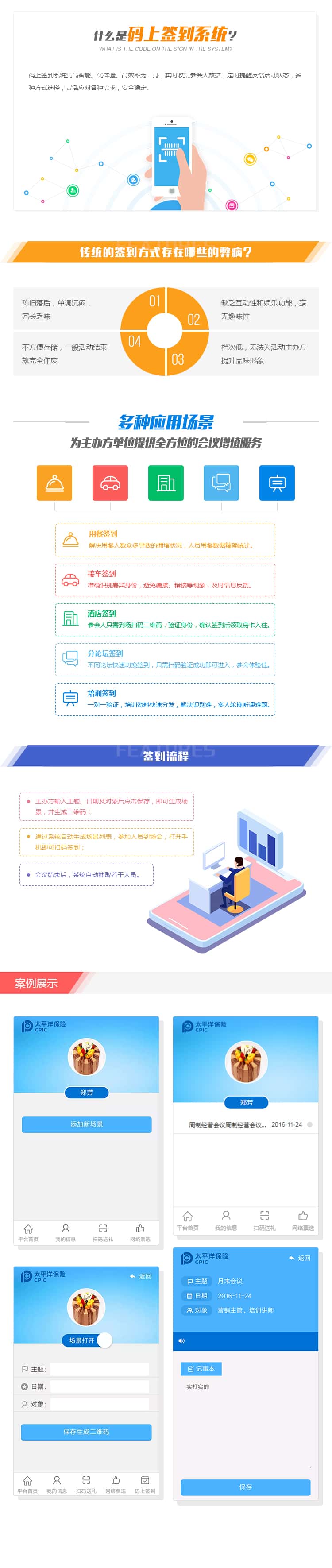 通过系统自动生成场景列表,参加人员到场会,打开手机即可扫码签到;